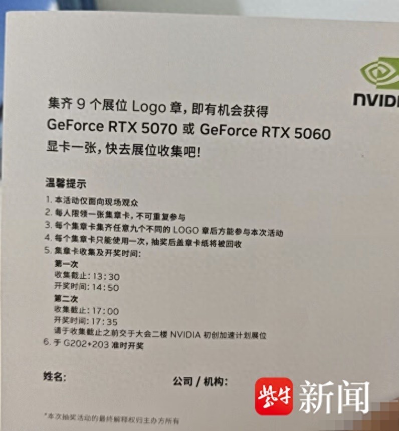现场的集章抽奖卡。据介绍,小金领奖后,同事先是建议他“要不卖了换钱”,但小金表示想留着组装电脑。没想到,当晚该同事给他发来消息并打来电话,称此事公司财务已知晓,“你是代表公司参加活动,出行费用由公司承担,这个显卡理应属于公司财产,下周一你把它带过来”。小金告诉记者,虽然奖品价值不是特别高,但是自己中过的第一个大奖,因此非常在意,且令他感到气愤的是,感觉自己被“套路”了。